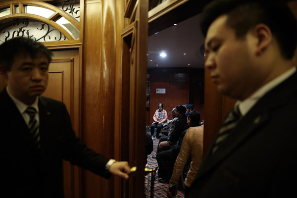 房間裡的許多人都來自北京,但也有壹些看上去是從老家遠道而來的人。來自江蘇省的壹名上了年紀的男子身穿深色燈芯絨夾克,平靜地坐在宴會廳的壹側,等著兒子回到自己身邊。壹名年輕的馬航員工給他倒了水,詢問了他的情況。
