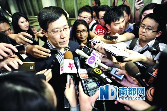3月10日,中國外交部領事司副司長、中國政府聯合工作組組長郭少春(中)壹行抵達吉隆坡機場接受媒體采訪。 陳輝 攝