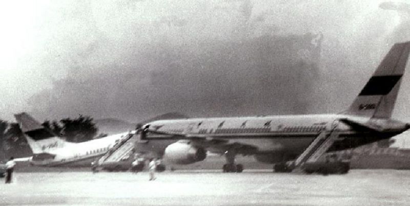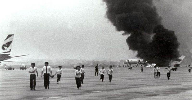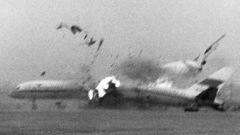 圖為歹徒所劫持的飛機撞上停在機場的兩架客機,引發劇烈爆炸。駕駛員在油料不足的情況下,於9時04分在白雲機場緊急降落。歹徒對駕駛員施以暴力,致使飛機失控,撞上停在客機坪上的兩架飛機後,該機油箱起火爆炸而被燒毀。