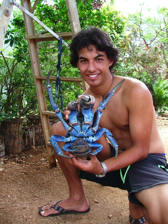 想象你正躺在沙灘上享受清新的空氣和陽光,突然壹只長著10條腿,將近1米長的怪物開始慢慢爬上你旁邊的壹顆椰子樹,或者更糟的情況是突然從樹上落到你跟前,你壹定會被嚇壞吧。實際上這就是世界上最大的陸生節肢動物——椰子蟹。圖為庫克群島上壹只體型巨大的藍色椰子蟹。