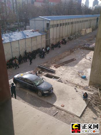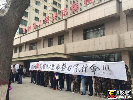 被打伤民工在甘肃省人民来访接待大厅打出标语:深挖血洗农民工黑恶势力保护伞!吴平摄