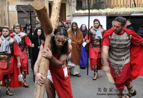 在意大利,壹名男子攜帶壹個描繪耶穌在耶穌的,通過Crucis重演木制的拾字架