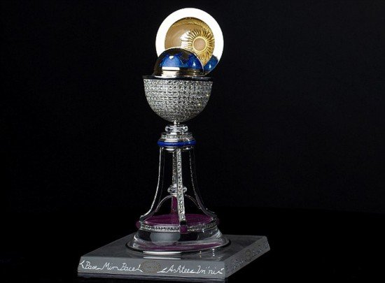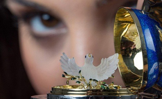 打开“幻影蛋”蛋壳后,可以看到里面装饰华丽的迷你地球仪。将地球仪顶端提起,里面是用无色水晶雕成的白鸽。