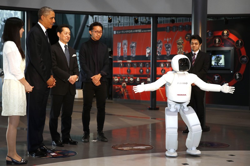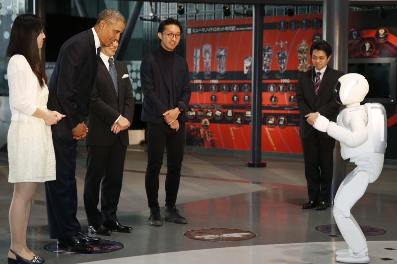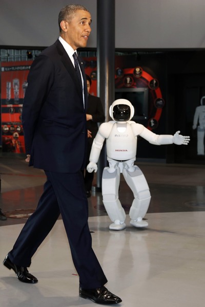 美國總統奧巴馬4月23日抵達日本開始叁天兩夜的國事訪問,25日將訪問韓國等其他亞洲叁國。在如此緊張的訪問行程中,奧巴馬還沒有忘記賣萌搞怪,令隨行人員驚奇。按照行程安排,24日奧巴馬參觀“新興科學和創新國家博物館”。在聽罷宇航員介紹國際空間站情況後,奧巴馬對本田機器人“阿西莫”(ASIMO)產生好奇,向它打招呼示好,並切磋球技,最後還向它鞠躬賣萌。
