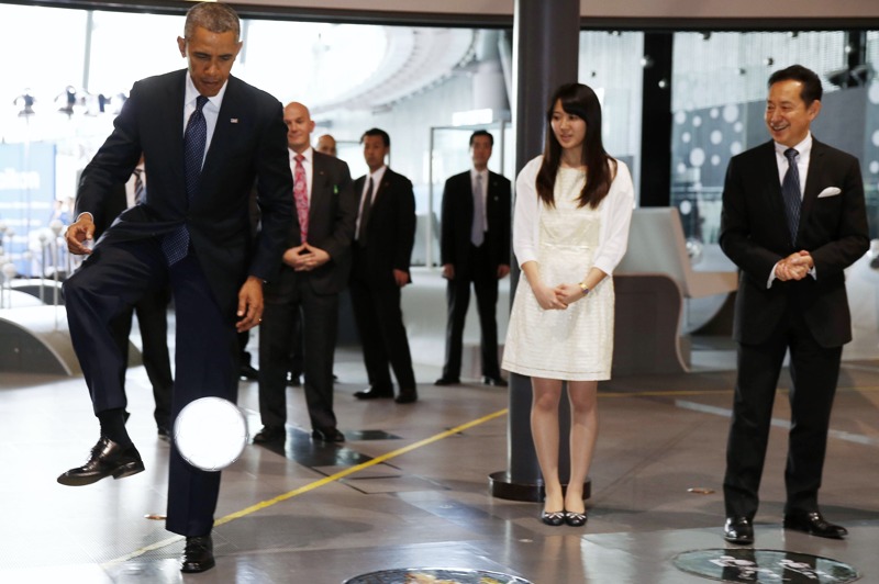 4月24日,日本東京,正在日本訪問的奧巴馬參觀“新興科學和創新國家博物館”並與本田機器人“阿西莫”(ASIMO)踢球互動。圖為奧巴馬接受“挑戰”。