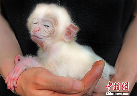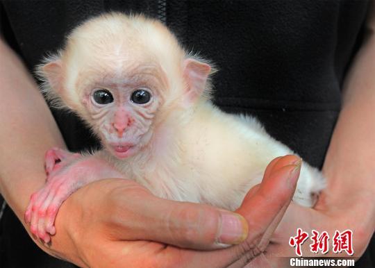 這只小猴身體毛色雪白,頭頂部分毛呈黃色,爪子呈粉紅色,其形體與普通獼猴無異。吳朝璽介紹,這只小猴出生不久便遭母親“遺棄”,目前靠人工喂養,食物主要是牛奶,已經出生壹周了,身體狀良好。