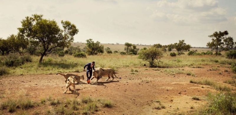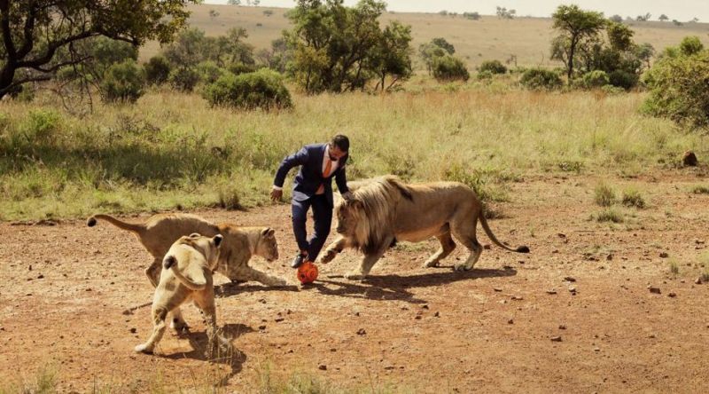 據英國《每日郵報》6月4日報道, 隨著巴西世界杯的臨近,壹個短片在網絡上迅速走紅,視頻中展示的事被稱作“獅語者”的動物園管理員凱文(Kevin Richardson)與叁只獅子上演的壹場足球對決。