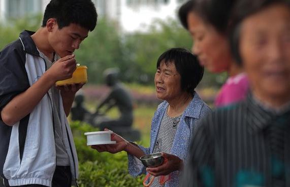 6月3日,71歲的潘奶奶送飯到學校給孫子吃,老人壹直端著盛菜的碗,等著孫子夾菜。