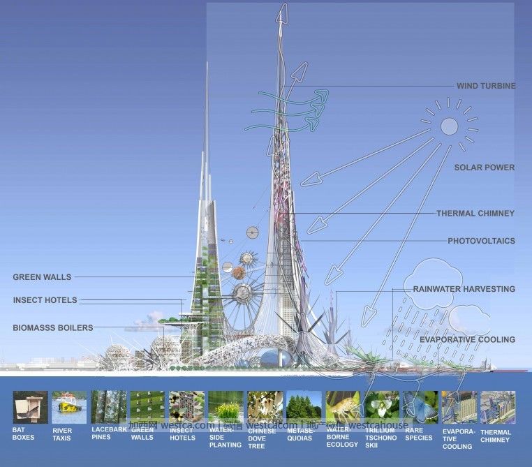 鳳凰塔如果建設完成,它將充滿各種高科技,該塔的設計目的是為了減少武漢市的污染水平。其中較矮的塔擁有植物牆、昆蟲酒店和生物質鍋爐,而較高的那座外面覆蓋著光伏板,用來收集太陽能。塔上的壹個萬花筒將由風輪機驅動。