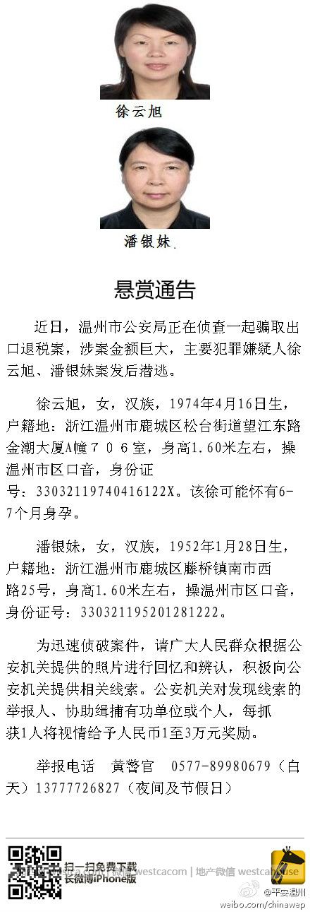 北京8月2日電 據溫州市公安局官方微博@平安溫州消息,近日,溫州市公安局正在偵查壹起騙取出口退稅案,涉案金額巨大,主要犯罪嫌疑人徐雲旭、潘銀妹案發後潛逃。