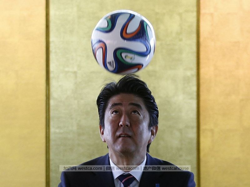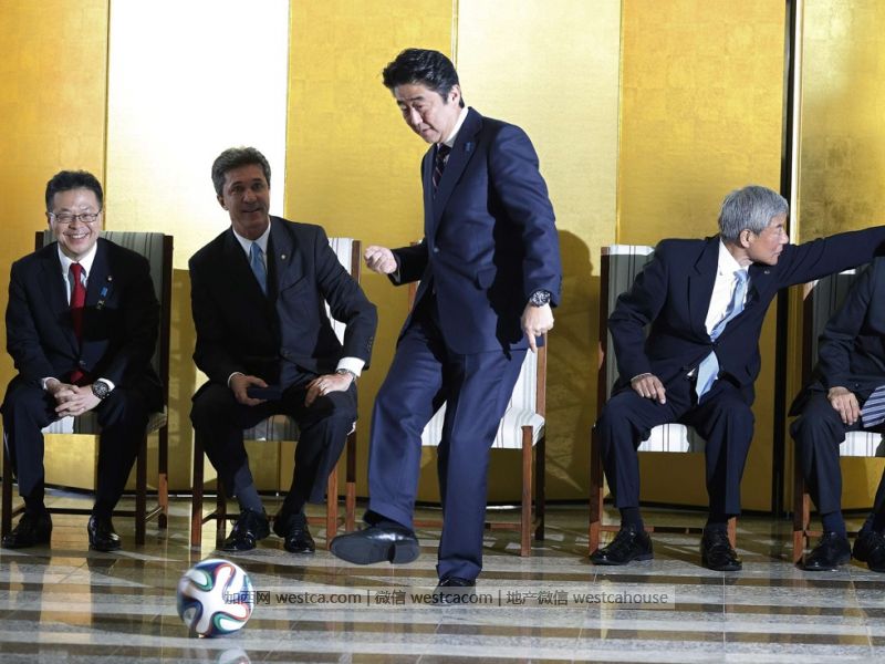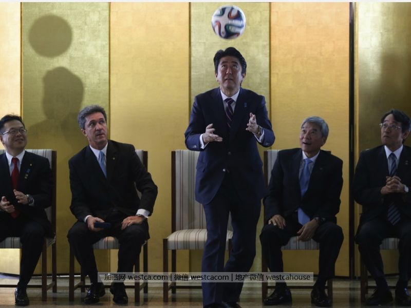 日本首相安倍晉叁用頭將球頂起。在剛剛結束的巴西世界杯上,日本國家隊以1平2負的慘淡成績小組賽遭遇淘汰。