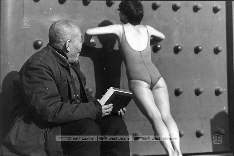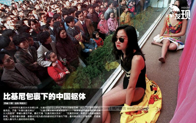 自從1946年比基尼泳衣發明以來,比基尼已經遠遠跳脫了游泳衣物的范疇,成為了眼球經濟的必備良品。於是“車展比基尼美女”、“比基尼美女助興某某旅游節”、“某某樓盤開盤現場比基尼美女火熱登場”等噱頭屢見不鮮。最近又增“比基尼美女洗車”,“比基尼京劇”等更讓人跌破眼鏡的新聞。比基尼看似暴露,暴露出以性為賣點的眼球經濟節操與下限,最關鍵的那叁片薄布料,仍蓋住國人羞與外人道的性倫理觀。圖為1995年3月29日,上海市南京路上壹個剛開業的服裝百貨商店舉行促銷活動,請兩位泳裝模特坐進櫥窗,此舉引起了數以萬人的圍觀。彼時的上世紀90年代,比基尼剛剛傳入中國,泳衣模特的促銷方式還是引起了國人極大好奇。