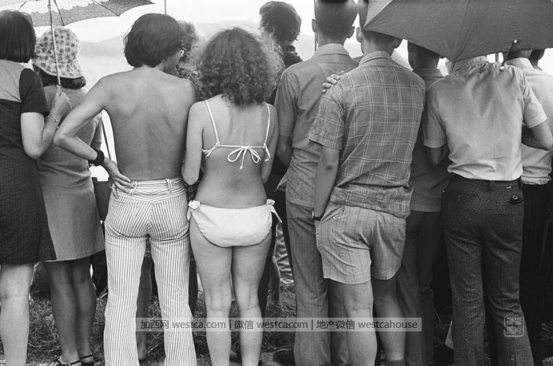 作為東方時尚之都,香港接受比基尼遠遠早於中國內地,圖為1972年,香港,在岸邊觀看賽龍舟的人們。比基尼的名稱本來指太平洋的馬紹爾群島的無人島嶼比基尼島。1946年6月30日,美國軍方在太平洋的比基尼島上爆炸了原子彈,18天以後,壹位名叫路易斯·裡爾德的法國人推出了胸罩樣式上衣和叁角褲泳裝。20世紀50年代,這種能體現人體雕塑感的服裝款式才被接受。今天,它已是柔美而自然的身體曲線的代名詞。贰戰後,“新風貌”符合時代轉變的趨勢,再次在服裝上強調女性隆胸豐臀、腰肢纖細以及肩部柔和的曲線,轟動巴黎乃至整個西方世界。