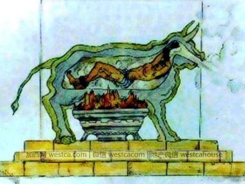 24、铜牛刑。又称西西里牛,是一种发明于古希腊的刑罚。铜牛身上有一个可以打开的门,里面是中空的。犯人被关进牛里之后,在牛的下方点火,直到把铜烧红。让犯人慢慢被烤死。铜牛设计用于放大犯人的哀嚎声,让那些凄厉的叫声听起来像是牛的吼叫声。