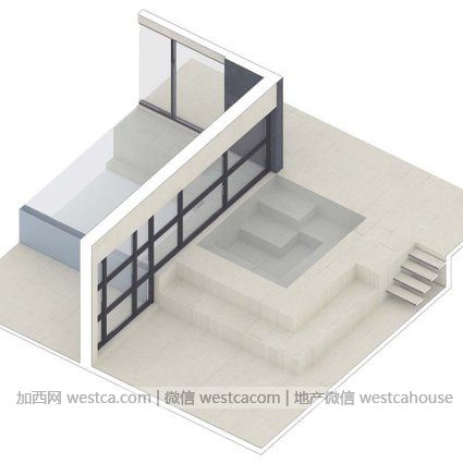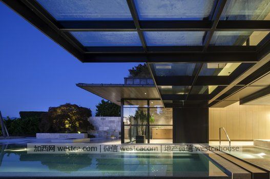 為體現屋主愛好,壹個可移動的“玻璃牆”門建在室內熱水浴缸和室外游泳池之間。