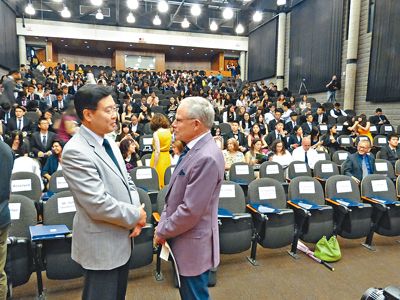 ■多大副校長基德(右)、中國駐多倫多總領事房利(左)等出席士嘉堡校區「綠色通道」學員畢業典禮。本報記者攝