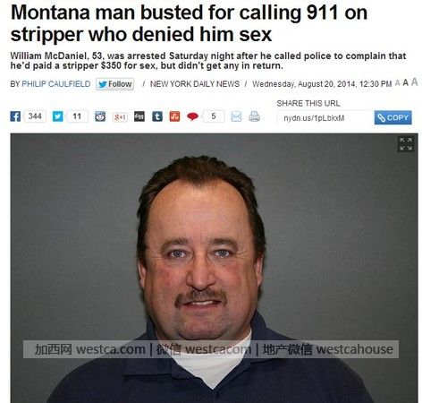 現年53歲的丹尼爾(William McDaniel),他付給脫衣舞娘350美元(約台幣10,497),卻沒有得到他所期待的「特別服務」,認為自己「被敲竹杠」於是他撥了911向警察投訴,結果警方反倒因他從事非法的情色交易而逮捕他,於上周六(8月16日)進了看守所。