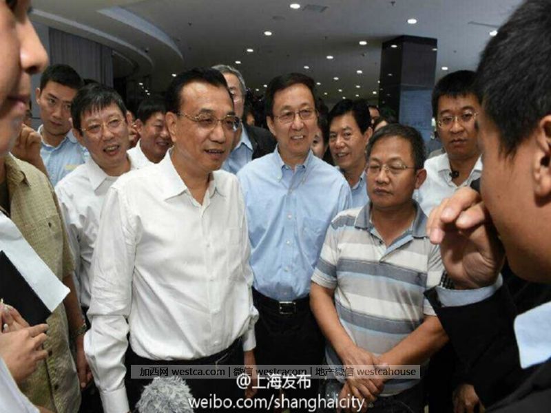 李克強(前排中)考察上海自貿區,韓正(右)、楊雄(左)伴身左右