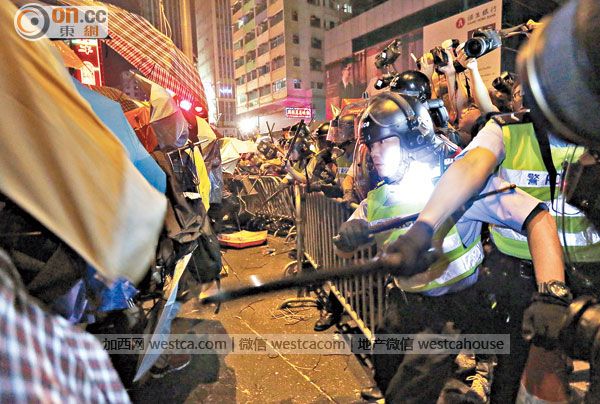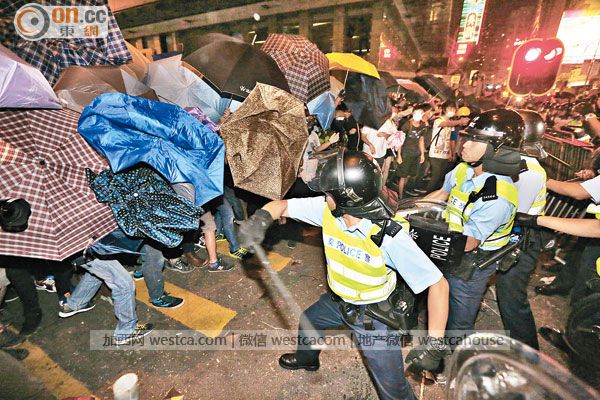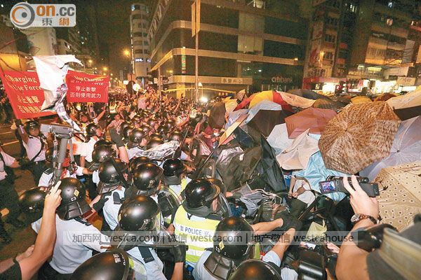 數百示威者圖擴大占領彌敦道壹帶主要路口,齊起沖擊警方防線,場面失控,大隊警員揮動警棍阻擋及驅趕,雙方爆發激烈沖突,現場頓陷大混亂,叫囂聲震天,警方調派大批警力增援,沖突中,有多人包括警員受傷,亦有多人被捕。
