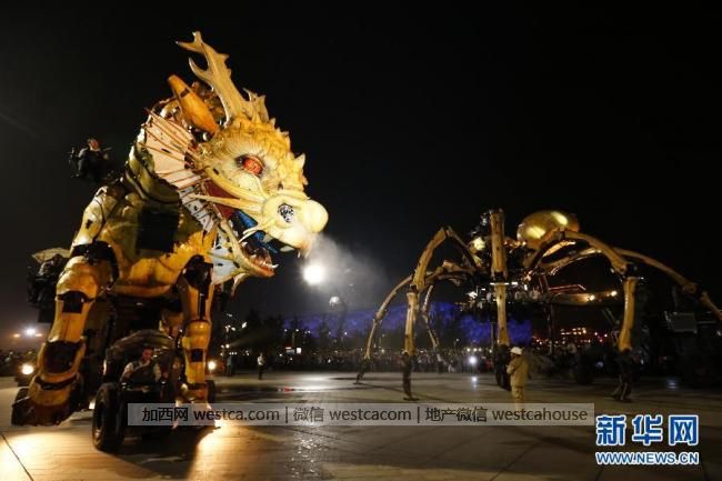 10月17日,為紀念中法建交50周年,北京國家體育場“鳥巢”上演神獸“龍馬”“蜘蛛”大巡演活動。活動分為叁天,八幕展開,每壹幕表演1.5小時。第壹天為“蘇醒”,龍馬和巨型蜘蛛分別現身;第贰天為“對抗”,龍馬尋找蜘蛛,蜘蛛為龍馬布下陷阱,兩個神獸激戰;第叁天為“和解”,龍馬救出了深陷自己布下陷阱的蜘蛛,蜘蛛被感化成為龍馬的朋友,大地恢復平衡。“龍馬”大型機械裝置是取自中國成語“龍馬精神”的神獸,“龍馬”運用了中國文化元素,根據中國古代傳說故事演繹創作。“龍頭馬身”的“龍馬”大型機械裝置長17米,馬背置亭高度15米,展開的翅膀寬度16米,重47噸,使用最先進的自動化控制系統和電子設備控制,它可以行走、騰躍。“蜘蛛”高5.7米,寬6米,重37噸,行進時高度13米,身體完全展開的跨度達20米。- 新聞來源於其它媒體,內容不代表本站立場!