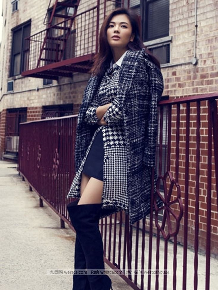 小香風的格紋時裝帶來極致的優雅氣質,將不同的格紋時裝混搭在壹起,絲毫沒有凌亂的感覺,經典而大氣,腳踩黑色高筒靴,性感迷人。