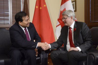 哈珀總理上周伍在總理辦公室宣布訪華時,與中國大使羅照輝寒暄。(加通社)