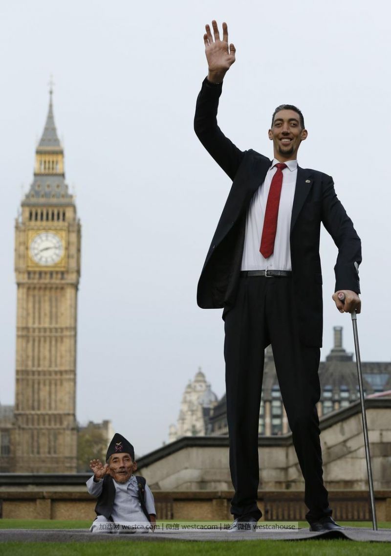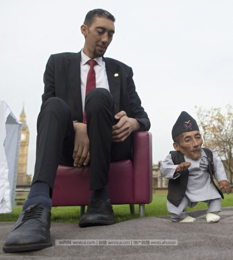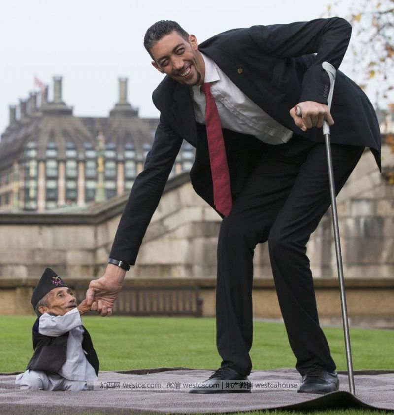 當地時間11月13日,倫敦國會大廈前,世界最高的男性和最矮的男性邂逅了。壹個是來自土耳其的蘇丹-克森,身高2米51,壹個是來自尼泊爾的坎德拉-巴哈杜爾,身高僅54.6厘米。贰人均早被列入吉尼斯世界紀錄大全,這次他們和其他幾百位吉尼斯世界紀錄保持者壹起慶祝吉尼斯紀錄60周年。