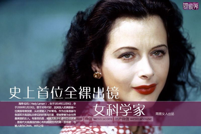 海蒂·拉玛是上世纪二三十年代好莱坞的影星,她被誉为“好莱坞花瓶”。电影公司在宣传中也往往突出她是“世界上最美丽的女人”,甚至连费雯丽也因长得像她而倍感自豪。