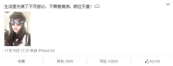 范冰冰隨圖附文,稱:“生活裡充滿了不可思議,不需要猜測,順應天意!”網友反應迅速,紛紛追問:“你是說你和李晨嗎?”“所以你和李晨在壹起了嗎?”