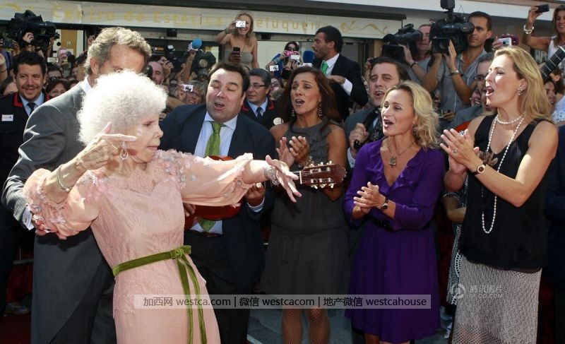 卡雅塔納來自歐洲最古老的貴族家庭,是西班牙世襲的阿爾貝公爵的第18代繼承人。她還是6個孩子的母親,擁有的財產達數億美元。同時熱愛時尚的她,有著壹頭標志性的卷發,也喜歡穿著艷麗,只要她出現的地方都惹人注目。資料圖:2011年10月5日,卡雅塔納在眾人面前起舞。