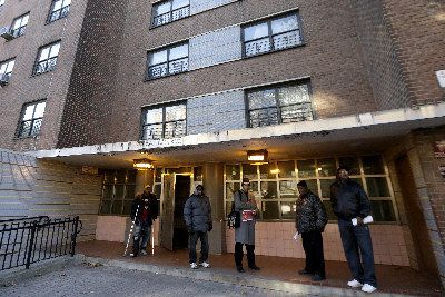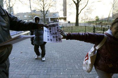 紐約市壹名華裔新手警察20日晚在布碌崙政府樓黑暗的樓梯間,誤殺沒有持槍的28歲男子。圖為民眾在命案現場外散發傳單,上面印有該政府樓附近被警方槍殺者的大頭照。(美聯社)