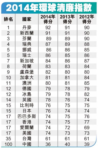 德國的“透明國際”公布2014年環球清廉指數,加拿大以81分,在全球被評估的175個國家中位列第10。顯示加拿大的廉潔情況理想。而中國比2013年下跌4分,排名由去年的80跌至今年的100名。香港得分則連續3年下跌,排名17。