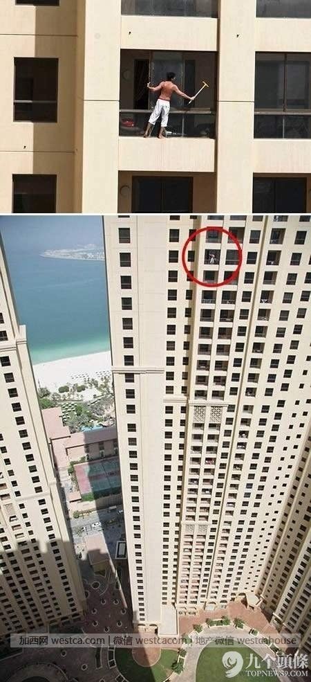 上圖中壹名迪拜窗戶清潔工人在擦拭玻璃窗。工人的位置是在壹座34層400英尺高的商業大樓窗台上。他站出狹窄的窗台上,抓著窗框,探身出去擦去玻璃污跡。這是在用生命和勇氣來工作啊!