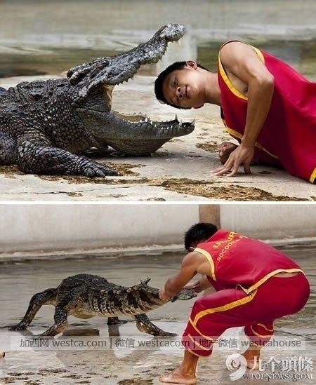 泰國叁攀動物園的鱷魚摔跤手每天都在與鱷魚壹起表演,斗鱷人把自己的頭伸進大鱷魚的大顎之間,這是世界上最危險的工作之壹。