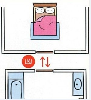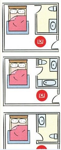 房間裡的廁所對到床,情況比房門對到廁所嚴重,對到頭,會頭痛、思考時不能集中,住久了會產生腫瘤、中風等;對到腰,會腰酸、心髒無力、水腫,住久了會產生糖尿病、心髒病;對到腳,會坐骨酸痛、膝蓋無力、痛風水腫,住久了會產生意外骨折。