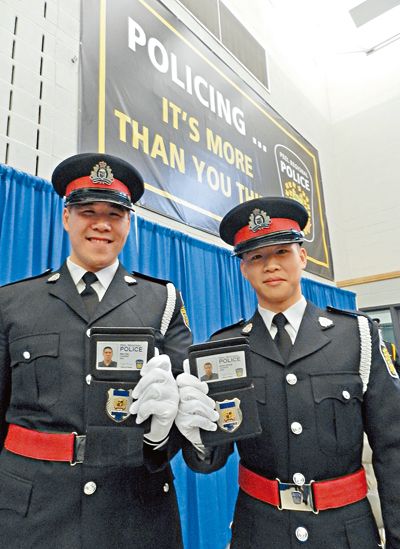 今年26歲的許立群及24歲的張賢凱在親友見證下,從皮爾區警察總長伊雲絲(Chief Jennifer Evans)及法官居裡(Justice Paul Currie)手中,領取代表警員身份的警章,正式成為服務社區維護治安的警隊壹員。