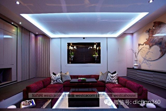 用科技創造壹切的空間,進門碩大的下沉式客廳,艷麗的沙發顏色和深色的地板白色的牆壁,形成壹種現代豪華感。