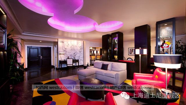 在加州迪士尼樂園酒店裡,有這樣壹個以米奇為主題的套房。想象壹下坐在套房的沙發上,好朋友米奇擺著各種pose陪你壹起看電視,還有米奇頭形狀的頂燈為你們灑下浪漫的紫色光暈;當你准備進入夢鄉,米奇搖身壹變指揮家,為你奏響晚安曲。