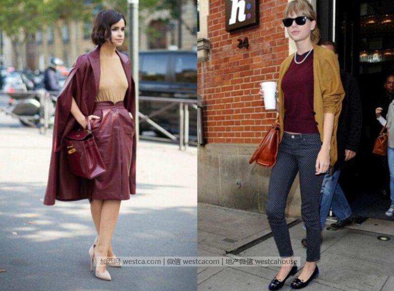 色彩搭配:勃艮第酒紅+裸色