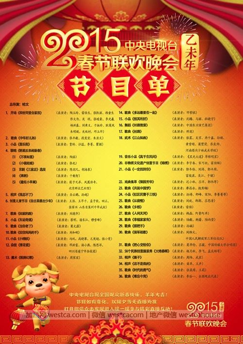 (加西网综合)温哥华时间2月18日(周三)凌晨4点,也就是咱中国大年三十晚上,北京时间2月18日晚上8点,备受瞩目的2015年中央电视台春节联欢晚会将正式拉开序幕!晚会节目单现已正式发布。总导演为哈文,整台晚会共有36个节目,其中包括10个语言类节目,7个小品,3个相声;杂技、魔术、戏曲节目各1个;创意类节目4个,其中有1个武术节目。