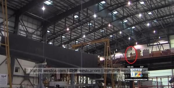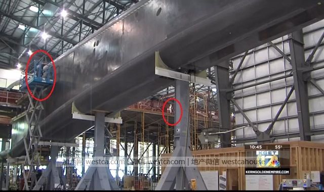 廠房中處於組裝狀態的“大鵬”飛機圖中為左側機身,注意紅圈內的工作人員尺寸
