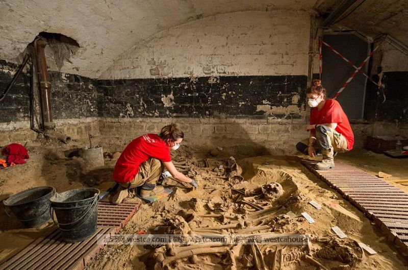 巴黎市中心MONOPRIX超市在翻修地下室的過程中遇到點“麻煩事”:工人施工意外發現了200余具人類骸骨。據悉,超市原址早期為壹座廢棄醫院的公墓,考古學家認為這些遺骨可能是14世紀法國鼠疫爆發的死難者。18世紀醫院廢棄時,這些人類骨骸“遺落”於此,繼續長眠地下300余年,整齊的排列在8個地下洞穴中。圖為兩位考古人員對墓穴中的骸骨進行發掘研究。