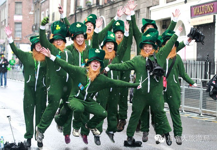 每逢此時,人們在蒙特利爾市中心舉行規模盛大的傳統化妝游行,200多年以前的壹幕幕經典場景,你在聖帕特裡克節上都可看到。游行出發時,興致勃勃的人們仍然穿上了綠色的服裝或戴上綠色的假發、帽子或眼鏡,臉上、身上畫著綠色的油彩,守候在道路兩旁,觀賞大游行,也有人壹起奏起愛爾蘭傳統音樂。晚上他們會去酒吧和參加派對,在那兒他們喝著啤酒,聽著愛爾蘭音樂、跳舞、狂歡。