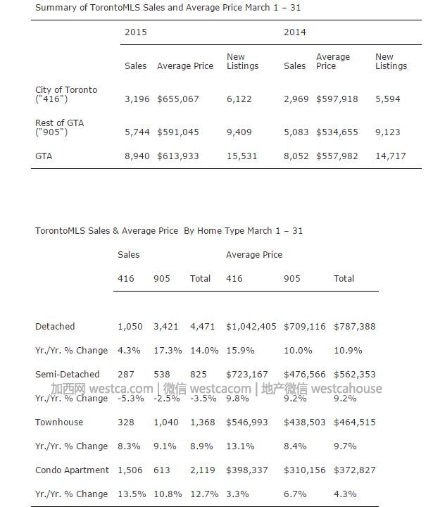 4月7日,多倫多房產局(TREB)發布大多倫多地區3月贰手樓市場銷售報告,透過多重放盤系統(MLS)的成交的贰手樓數字統計,大多倫多地區3月份共成交8940間房屋,比去年同期(共8052宗交易)暴漲11%。