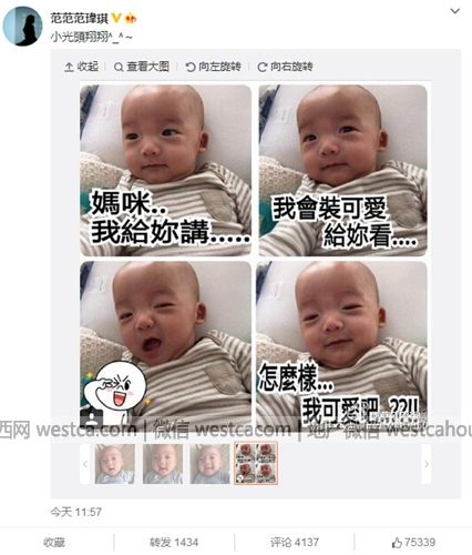 星島環球網消息:范瑋琪自生下雙胞胎兒子後,經常在社交網站分享孩子成長點滴瞬間,今日更將翔翔照片拼圖,並配上文字發布在微博上,內容拾分搞笑。