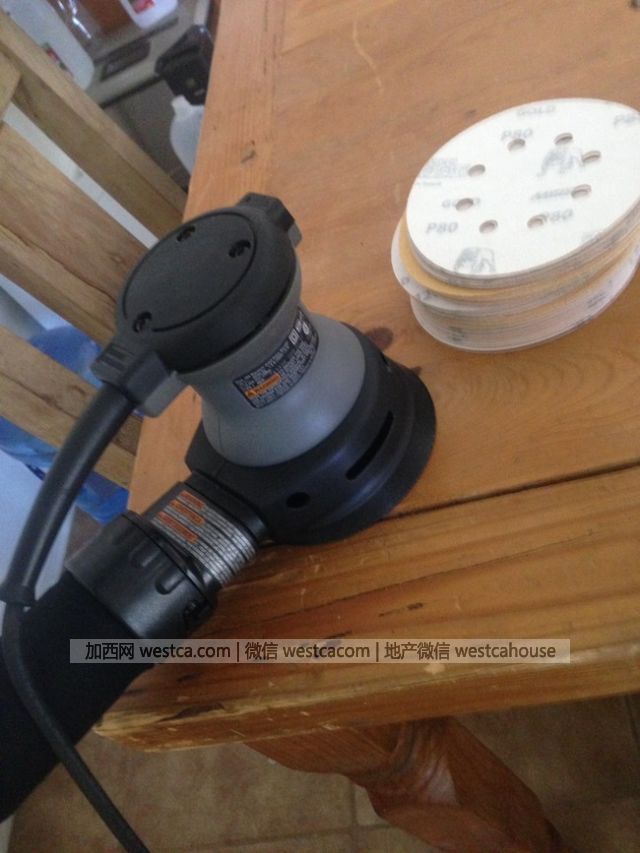 他開始用打磨機使回收的木柵欄變得光滑的。