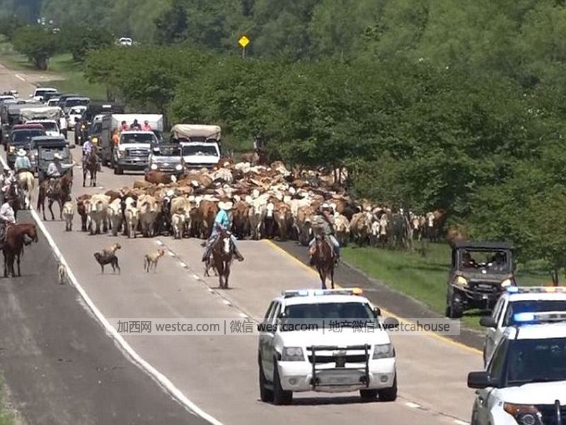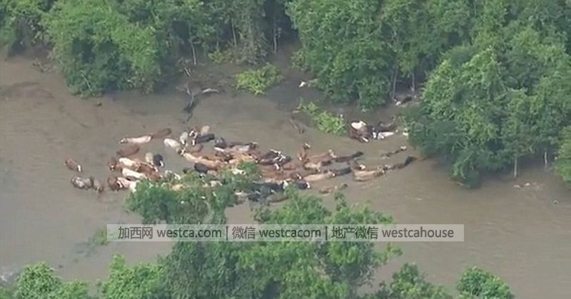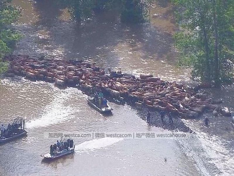 在得州戴頓(Dayton)Liberty Bell牧場的250頭小牛、350頭母牛以及12頭公牛被洪水圍困。幾名勇敢的牛仔涉險帶領被困牛群沖出洪水包圍圈,壹路走過70多英裡(約合113公裡),終於擺脫持續上漲的洪水威脅。