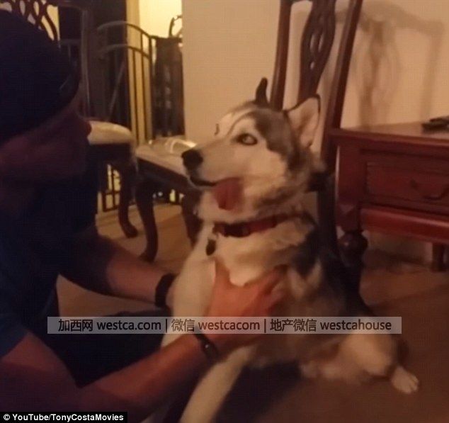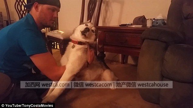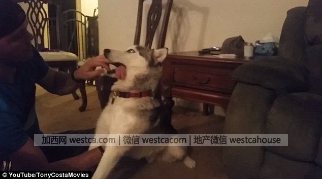 這壹過程被當時在場的狗主人室友錄了下來,上傳到網上。只見這只可憐的哈士奇兩眼發直,肆肢僵硬,半截舌頭都耷拉在嘴外邊。視頻中貌似是它主人的那名男子只好掰開它的嘴,把舌頭放回去。
