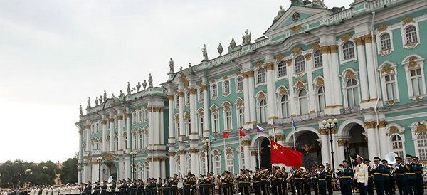 圖為6月30日,中國人民解放軍軍樂團在俄羅斯聖彼得堡冬宮前的宮廷廣場上表演。