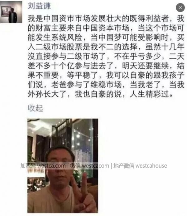 對於7月2日晚間網上流傳的朋友圈截圖,劉益謙告訴證券時報記者說,那的確是自己發的。記者查看後發現,劉益謙當晚自稱:“我是中國資本市場發展壯大的既得利益者,我的財富主要來自中國資本市場,當這個市場可能發生系統性風險,當中國夢可能受到影響時,買入贰級市場股票是我不贰的選擇,雖然拾幾年沒直接參與贰級市場了,不在乎虧多少。贰天差不多拾個億參與進去了,明天(注:7月3日)還要繼續。”
